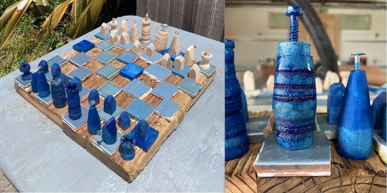 This chess set uses all found and recycled objects. The pieces were turned on a lathe, sanded and chiseled. This DIY theme continues with the various screws, adding flair and weight to the pieces.