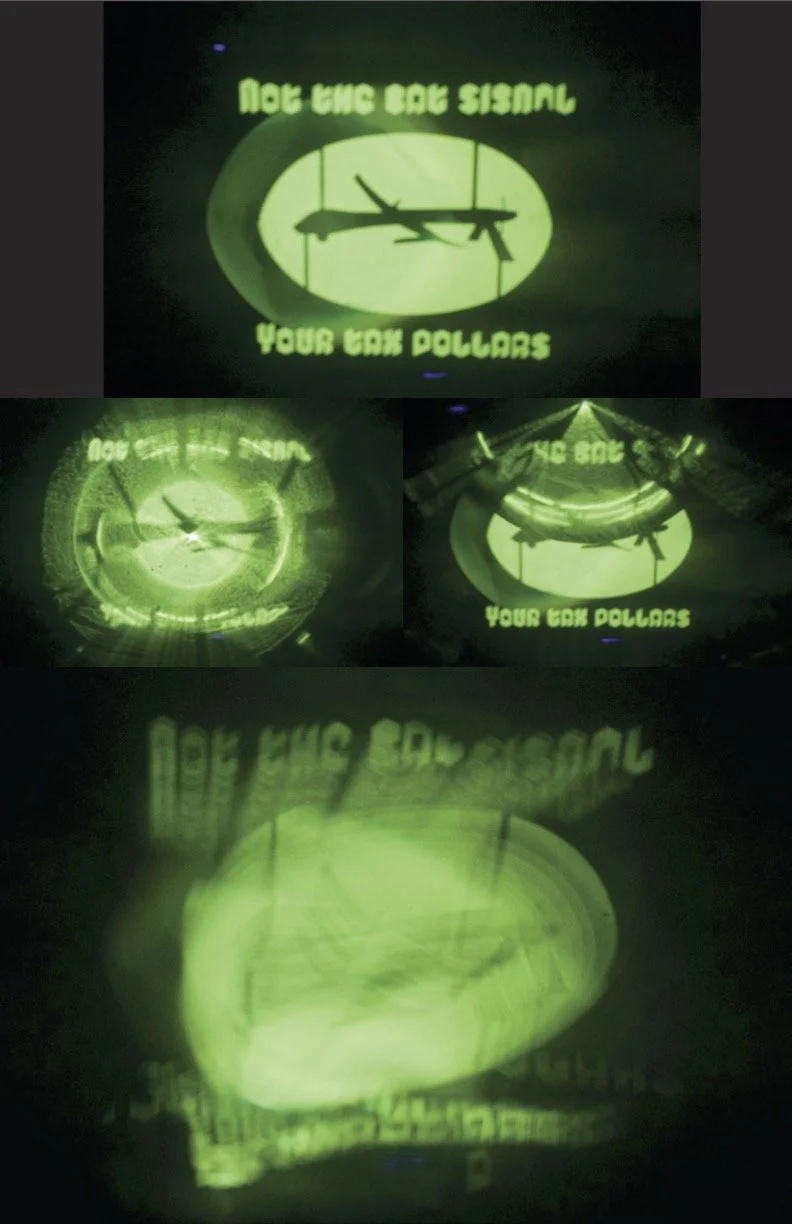 A series of photographs capturing distorted projections of laser cut panels. These feature custom stencil adaptations of Adhesive NR Seven and Metalista, allowing for counters to be preserved during lasercutting and allowing these fonts to be used as stencils. Reappropriation of the Bat Signal, something which symbolized justice and a return to order, evokes a strong contrast to the actions of our government.